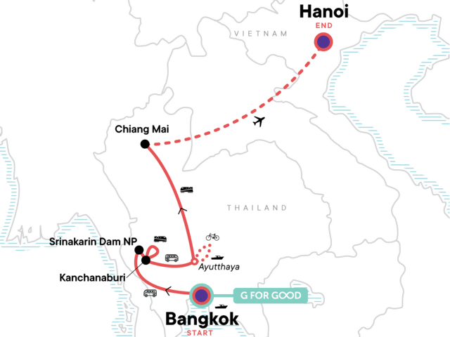 Your Foodie Moment: Street Food Dinner in Chinatown, Bangkok. Bangkok Klong Riverboat Tour. Visit Hellfire Pass and Ride the Death Railway. Visit Bridge on the River Kwai and Thai/Burma Railway Centre and Allied War Cemetery. Visit a Local Rice Farm. Ayutthaya Cycling. Boat Tour. Chiang Mai Old Town Orientation Walk. Chiang Mai Night Market Walk. Sunrise Alms Giving. Doi Suthep Temple Visit. Hanoi Old Town Cyclo Tour. Bia Hoi Corner and Microbrewery Crawl. All transport between destinations and to/from included activities.