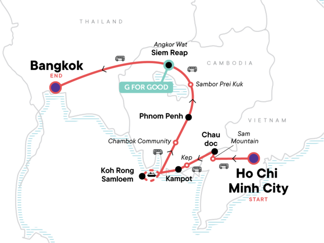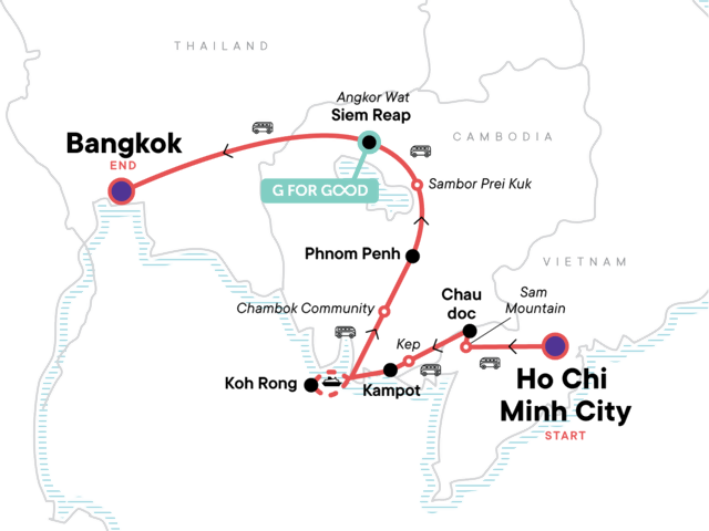 Your Welcome Moment: Welcome Moment - Meet Your CEO and Group. Motorbike tour including Hang Pagoda and Sam Mountain. Chau Doc floating market. Kep market walk. Tour of Monivong Bokor NP. Tour of Chambok Community with traditional lunch. Phnom Penh cyclo tour and dinner at one of best restaurants in Phnom Penh. Visits to Skun Market and Santuk Silk Farm. Tour of Sambor Prei Kuk Anicent Site. Visit Rong Klua Market. Visit Wat Sothorn Wararam Woraviharn. Walk and night out on Khao San Road. All transport between destinations and to/from included activities.