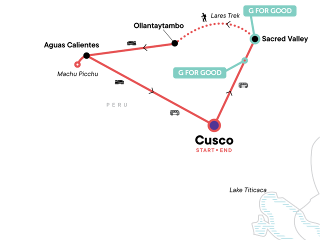 Your G for Good Moment: Handmade Biodegradable Soap Products. Sacred Valley guided tour. Pottery making demonstration. Guided Lares trek hike (3 days). Aguas Calientes stay. Machu Picchu guided tour. All transport between destinations and to/from included activities.